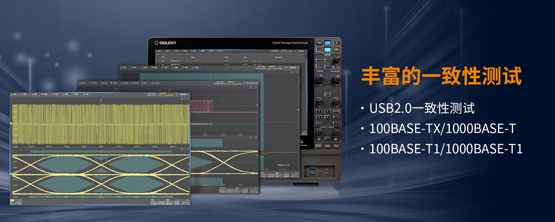 SDS7000A目前支持USB 2.0、100 BASE-TX、1000 BASE-T、100 BASE-T1、1000 BASE-T1等多种协议一致性测试。这些一致性测试分析功能可以帮助工程师在大规模生产前进行电气性能和功能测试,从而保证产品的质量和可靠性。鼎阳科技推出的一致性分析方案可以执行单项或多项测试、向用户展示如何将示波器和被测设备连接、为每个测试项目自动设置示波器、显示已执行测试的每个项目的详细信息和通过标准、生成HTML或XML测试报告