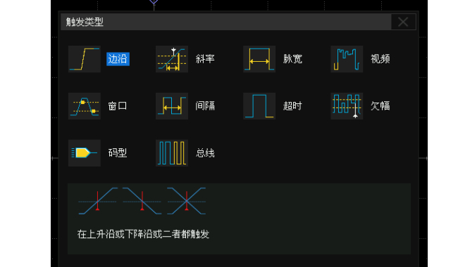| 触发类型 | 边沿(Edge)、斜率(Slope)、脉宽(Pulse width)、窗口(Window)、欠幅(Runt)、间隔(Interval)、超时(Dropout)、码型(Pattern)、视频(Video)、串行触发(IIC、SPI、UART、CAN、LIN) |