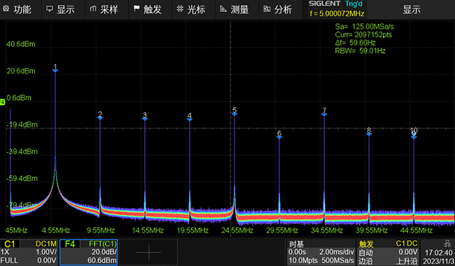 内置 FFT 功能,最大运算点数为 2M 点,4 条独立 Math 波形,支持用户自定义运算表达式。在优越的频谱分辨率下可更准确的分析信号频率成分及能量分布,轻松化身一台频谱分析仪。FFT模式下支持多种窗函数,支持普通、平均、最大值保持等模式,支持峰值检测,自动检测杂散频率并标记形成列表显示。