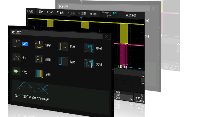 | 触发类型 | 边沿(Edge)、斜率(Slope)、脉宽(Pulse width)、窗口(Window)、欠幅(Runt)、间隔(Interval)、超时(Dropout)、码型(Pattern)、视频(Video)、前提边沿(Qualified)、第N边沿(Nth edge)、延迟(Delay)、建立/保持时间(Setup/Hold time)、串行触发 |