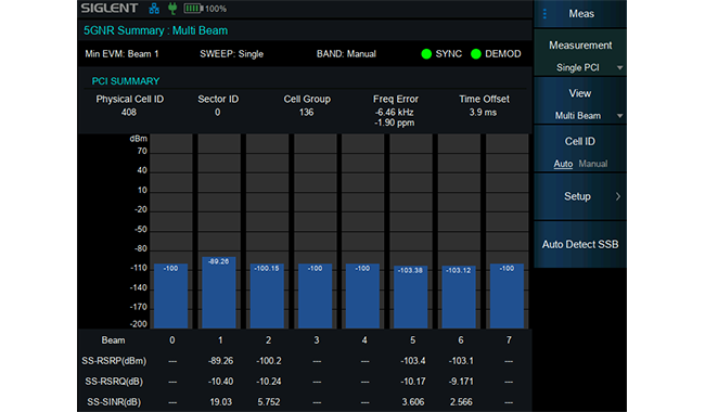 SHA860A的5G NR OTA测量功能可以对多小区进行空中接口(OTA)的测试,提供物理小区 ID、波束号、 GSCN、SS-RSRP 、SS-RSRQ、SS-SINR、SS-RSSI、EVM等解调指标。